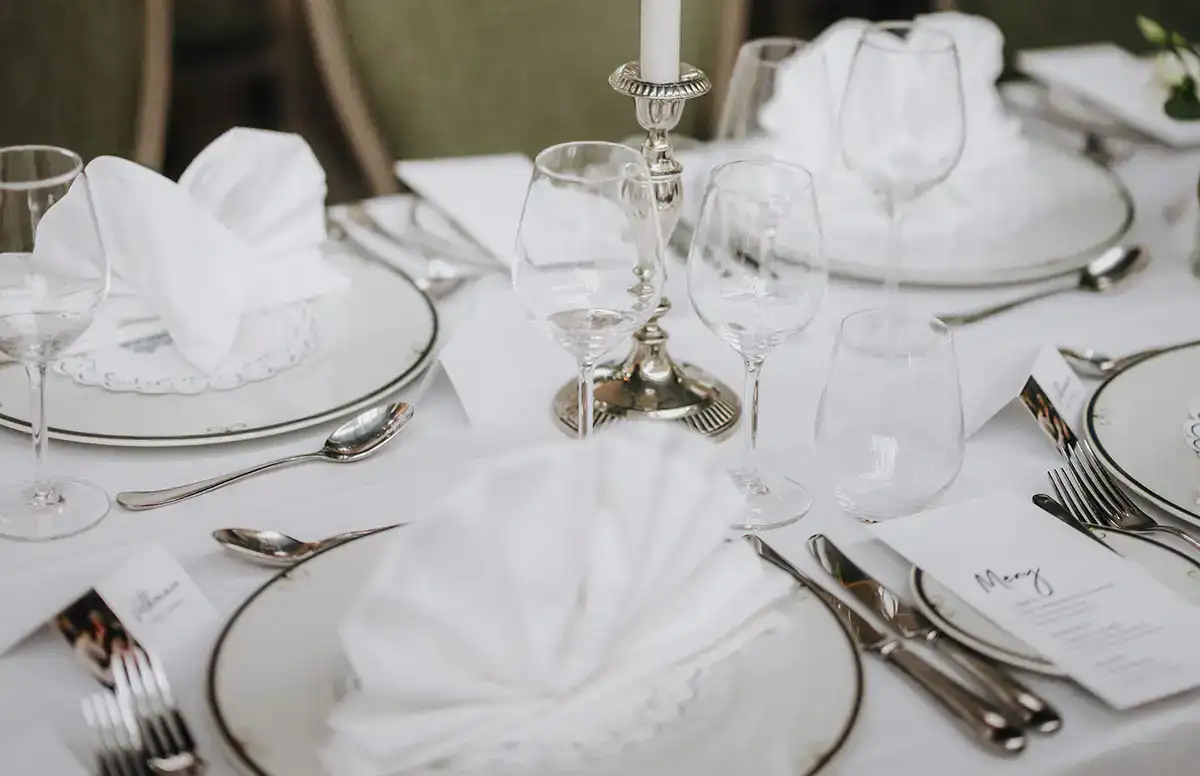 Setup in the evening is a banquet. Tonight’s dinner is arranged with a table setup in larger groups. This means that we do not use individual small tables or two-person tables.